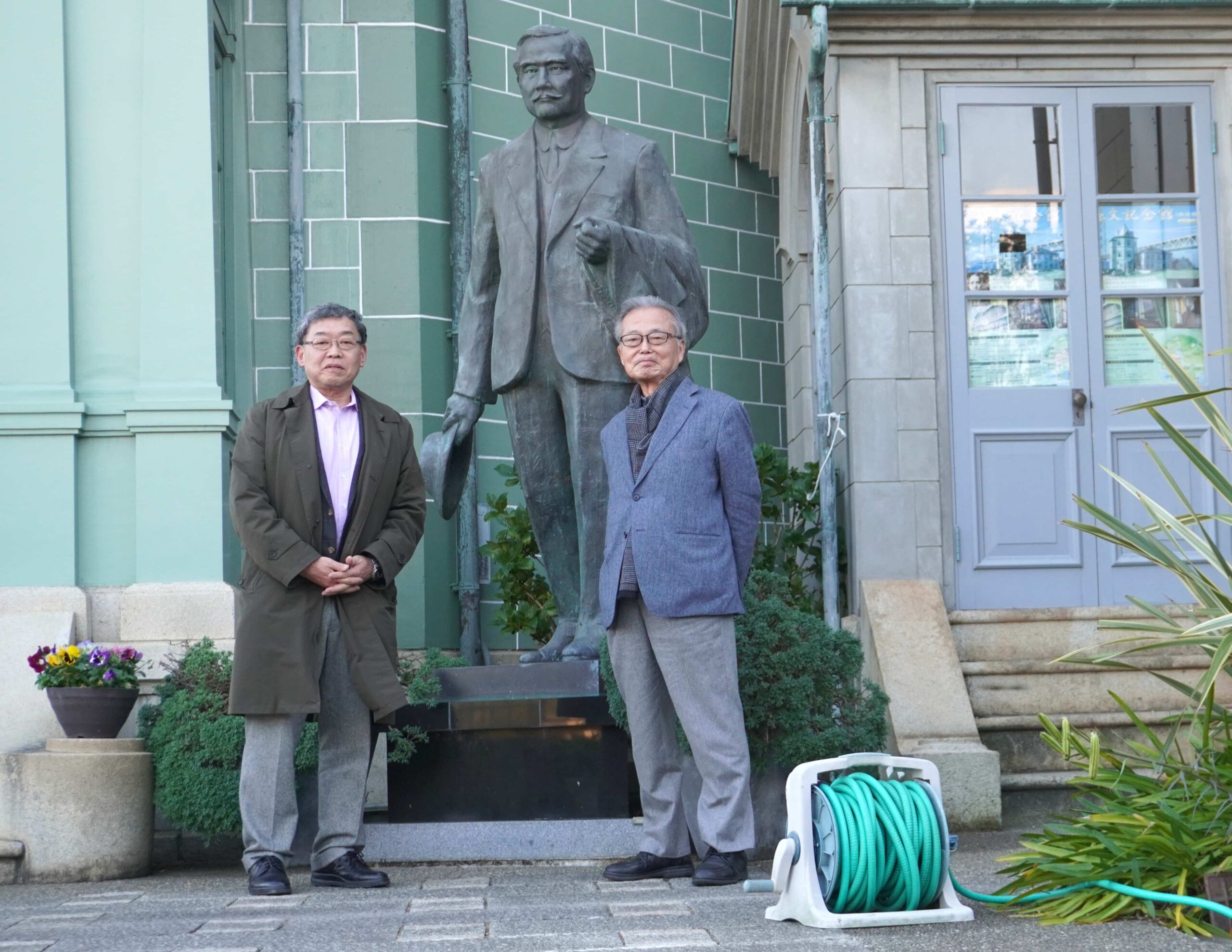【12】北の国から遥々やってきた番記者との再会/11-20 ギャラリー 2025年11月23日 ad-akamatsu 今をさる30年ほど前に公明党担当番記者だった北海道新聞の相原秀起記者が遥々北海道からやってきました。今は、同地でノンフィクション集団の代表を務めています。取材で鳥取に行った帰りに立ち寄ってくれました。(神戸舞子公園の移情閣の孫文像前で 11-20)