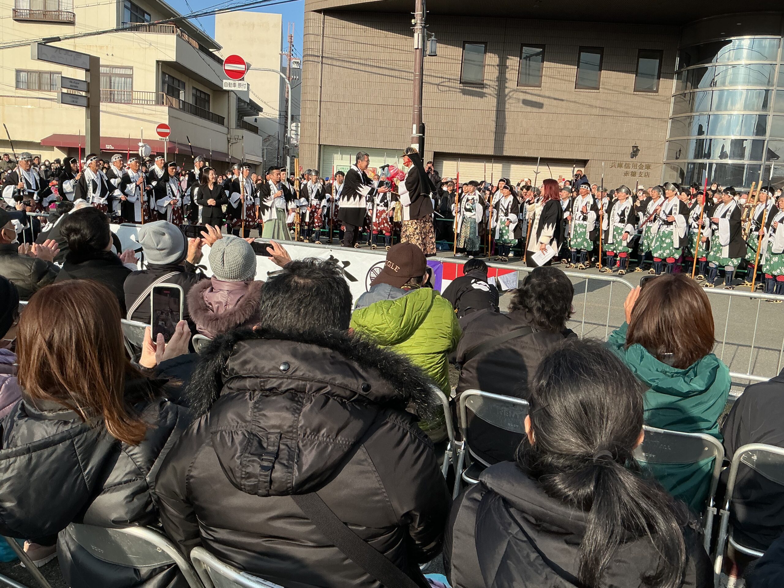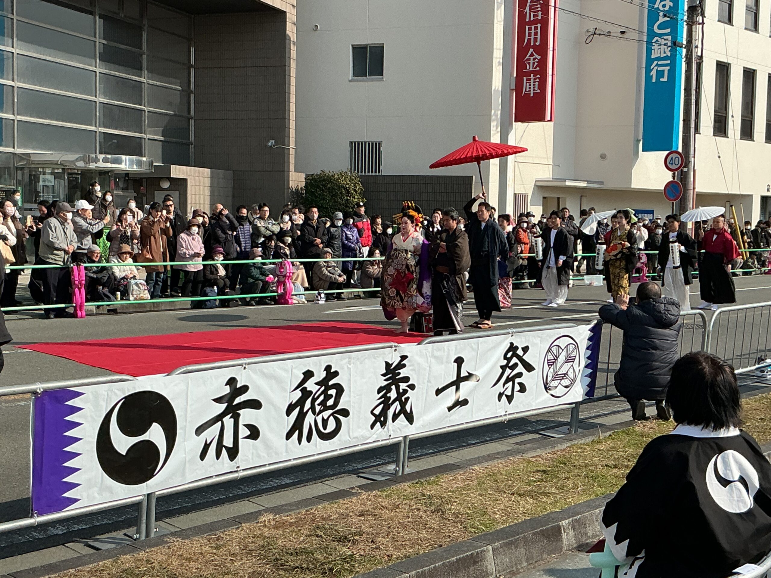 【15】赤穂義士祭に参加して/12-14 ギャラリー 2025年12月14日 ad-akamatsu 15 赤穂義士祭に参加した仲間たちと(写真上)。赤穂義士祭のパレードの最後に、赤穂市の牟礼市長から花束を受ける大石内蔵助に扮した俳優の内藤剛志さん(中央写真))と、パレード冒頭に同祭りに初めて登場した花魁役の徳由美子さん(下の写真)。